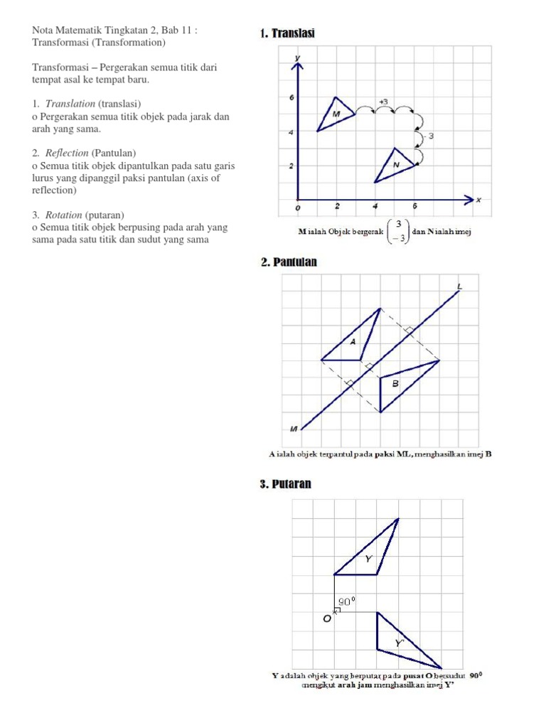 Soalan Translasi Matematik Tingkatan 2. Translation (translasi) o pergerakan semua titik objek pada jarak . Translasi seperti yang dikatakan sebelum ini, translasi ialah suatu jenis penjelmaan yang memindahkan semua titik pada suatu satah.